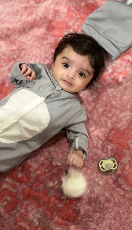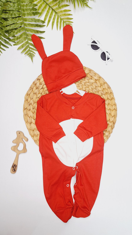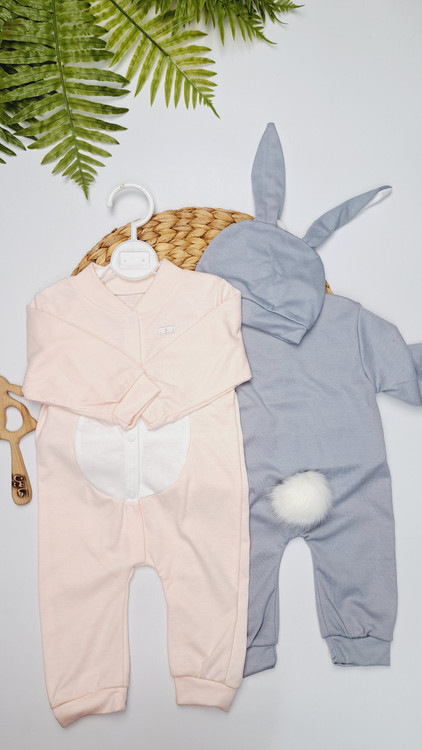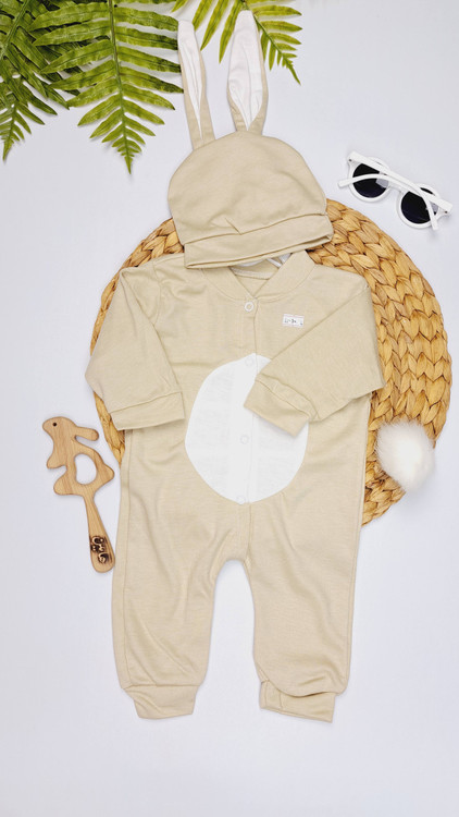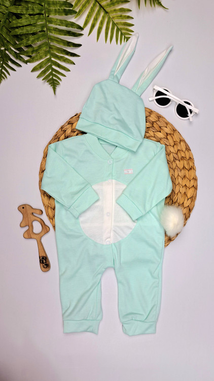 سرهمی نوزادی نخی کلاه گوش دار مدل خرگوش با دکمه جلو و پوم پوم پشت