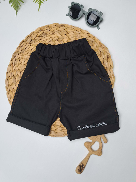شلوارک مشکی از پارچهی کتان باکیفیت دوخته شده و دارای جیب کاربردی برای راحتی کودک در بازی است.